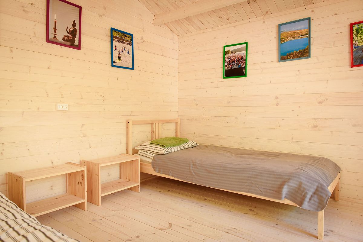 - Оснащение домиков: две односпальные кровати, две тумбы, шкаф