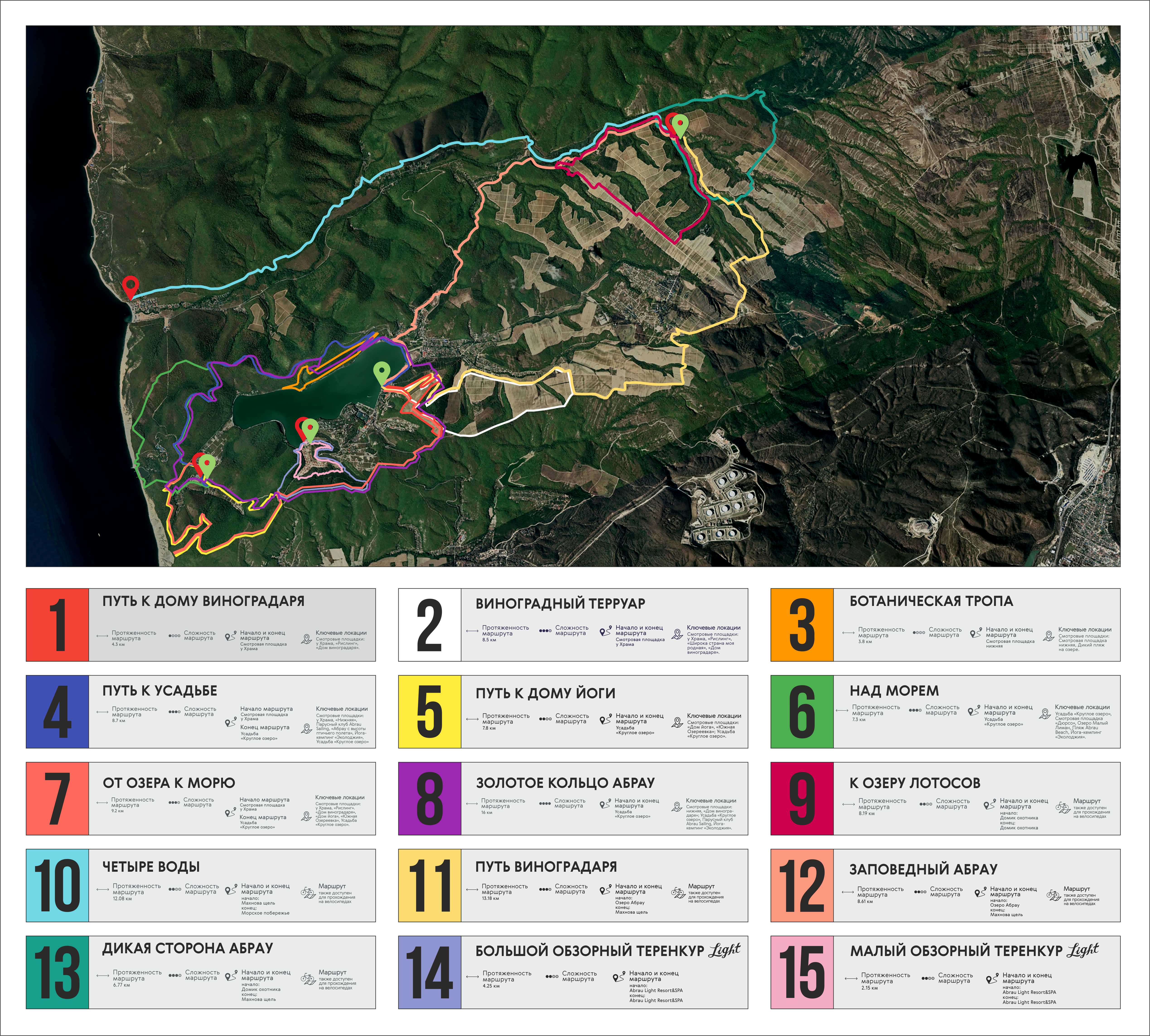 Ориентироваться в пути стало проще – на протяжении всех маршрутов установлены удобные навигационные указатели. Также появились комфортные места для отдыха, зоны для пикников и панорамные смотровые площадки. Пройти пешие маршруты возможно самостоятельно или в сопровождении гида от Центра туризма «Абрау-Дюрсо».